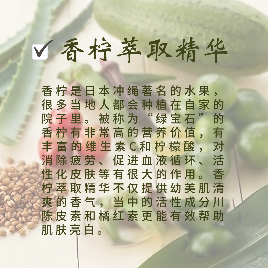 除了这4大成分,还有其他来自冲绳当地的成分包括有保湿镇定功效的芦荟精华、改善肌肤弹力的月桃叶精华、亮白肌肤的西印度樱桃精华、保湿舒缓肌肤的丝瓜精华、改善干燥肌肤的秋葵精华等等。