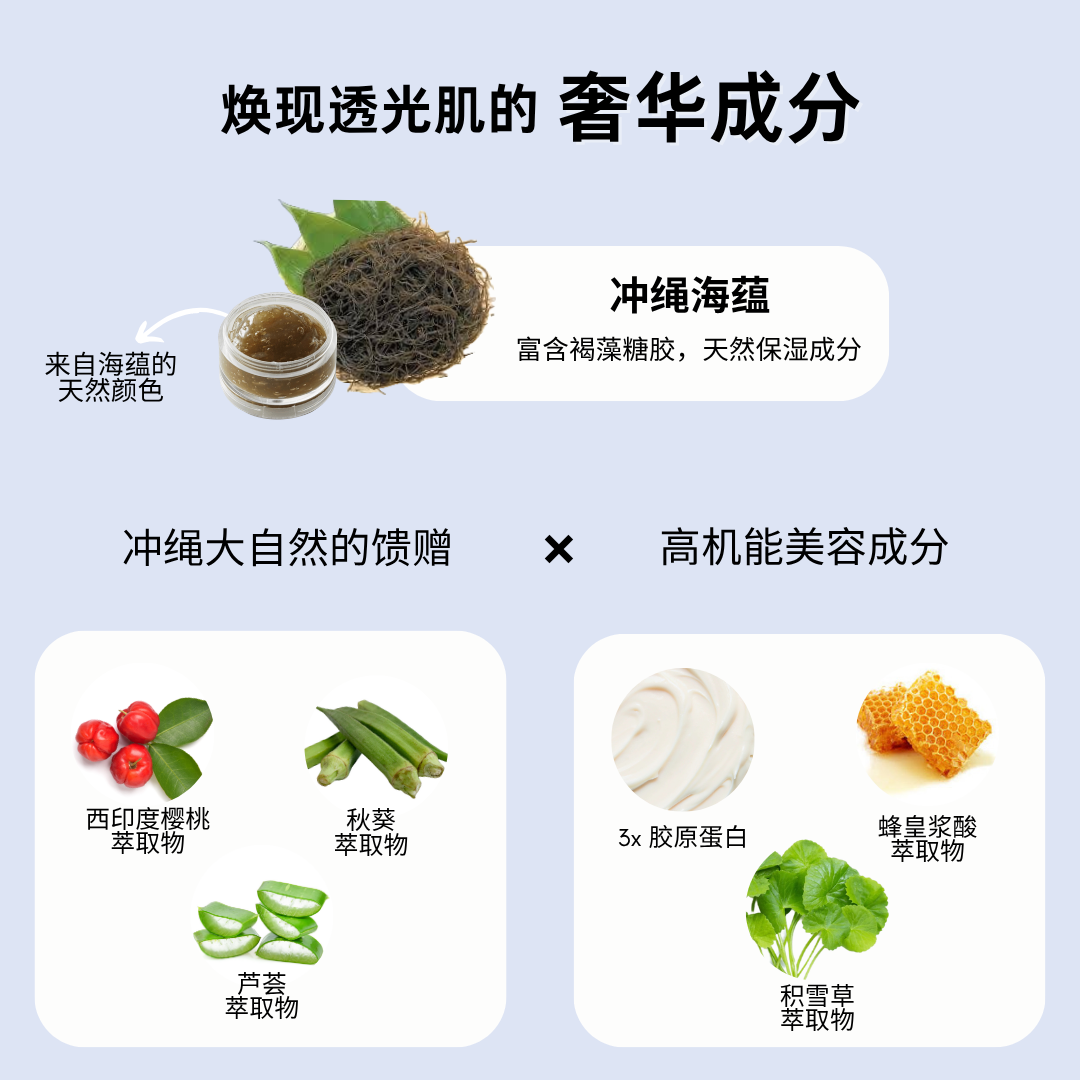 全成分: Water, Glycerin, Dipropylene Glycol, Butylene Glycol, Ethyl Perfluoroisobutyl Ether, Sodium C14-16 Olefin Sulfonate, Ethyl Perfluorobutyl Ether, Dipeptide Diaminobutyroyl Benzylamide Diacetate, Acetyl Hexapeptide-8, Hexacarboxymethyl Dipeptide-12, Methylglucoside Phosphate, Copper Lysinate/Prolinate, Cladosiphon okamuranus extract, Sodium Hyaluronate, Ethylhexyl Palmitate, Silica Dimethyl Silylate, Caprylyl Glycol, Hexylene Glycol, Malus domestica fruit cell culture extract, Lecithin, Hydroxypropyltrimonium Hyaluronate, C12-13 Alkyl Glyceryl Hydrolyzed Hyaluronate, Hydrolyzed Hyaluronic Acid, Collagen, Hydrolyzed Collagen, Soluble Collagen, Hydrolyzed egg shell membrane, Citrus reticulata(Tangerine) peel extract, Centella asiatica extract, Royal jelly extract, Citrus depressa peel extract, Malpighia punicifolia(Acerola) fruit extract, Aloe barbadensis leaf extract, Yokuinin Ekisu(Jpn), Hibiscus esculentus fruit extract, Alpinia speciosa leaf extract, Luffa cylindrica extract, Ascorbyl Glucoside, Enantia chlorantha bark extract, Oleanolic Acid, Hamamelis virginiana (Witch Hazel) distillate, Sapindus trifoliatus fruit extract, Sodium Bicarbonate, Dipotassium Glycyrrhizate, Arbutin, Urea, Acrylates/C10-30 Alkyl Acrylate Crosspolymer, Xanthan Gum, Methyl Gluceth-20, Potassium Hydroxide, Sodium Chloride, Cocamidopropyl Betaine, Potassium Cocoyl Glycinate, Cocamide DEA, Tetrasodium EDTA, Chlorophyllin-iron complex, Fragrance, Sodium Benzoate, Phenoxyethanol, Methylparaben, Propylparaben. | |
