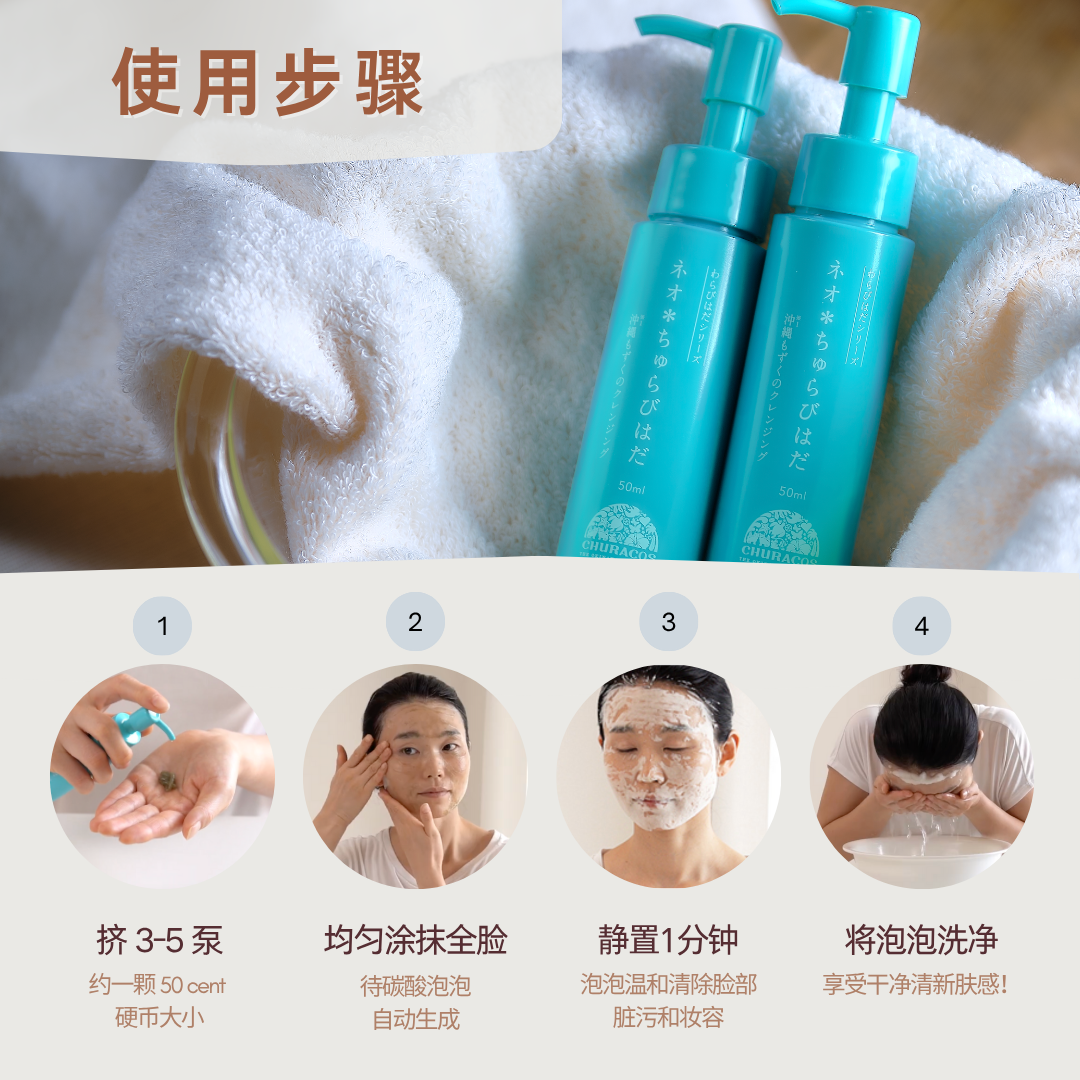 ①将水凝露挤在干爽的手上,压头约按压3-5下。②轻柔快速地涂抹于全脸。③静置约1分钟,让神奇的碳酸泡泡卸妆。④将卸妝泡泡清洗干净后,再搭配冲绳海泥洁颜乳洗脸,深层清洁不干涩! |