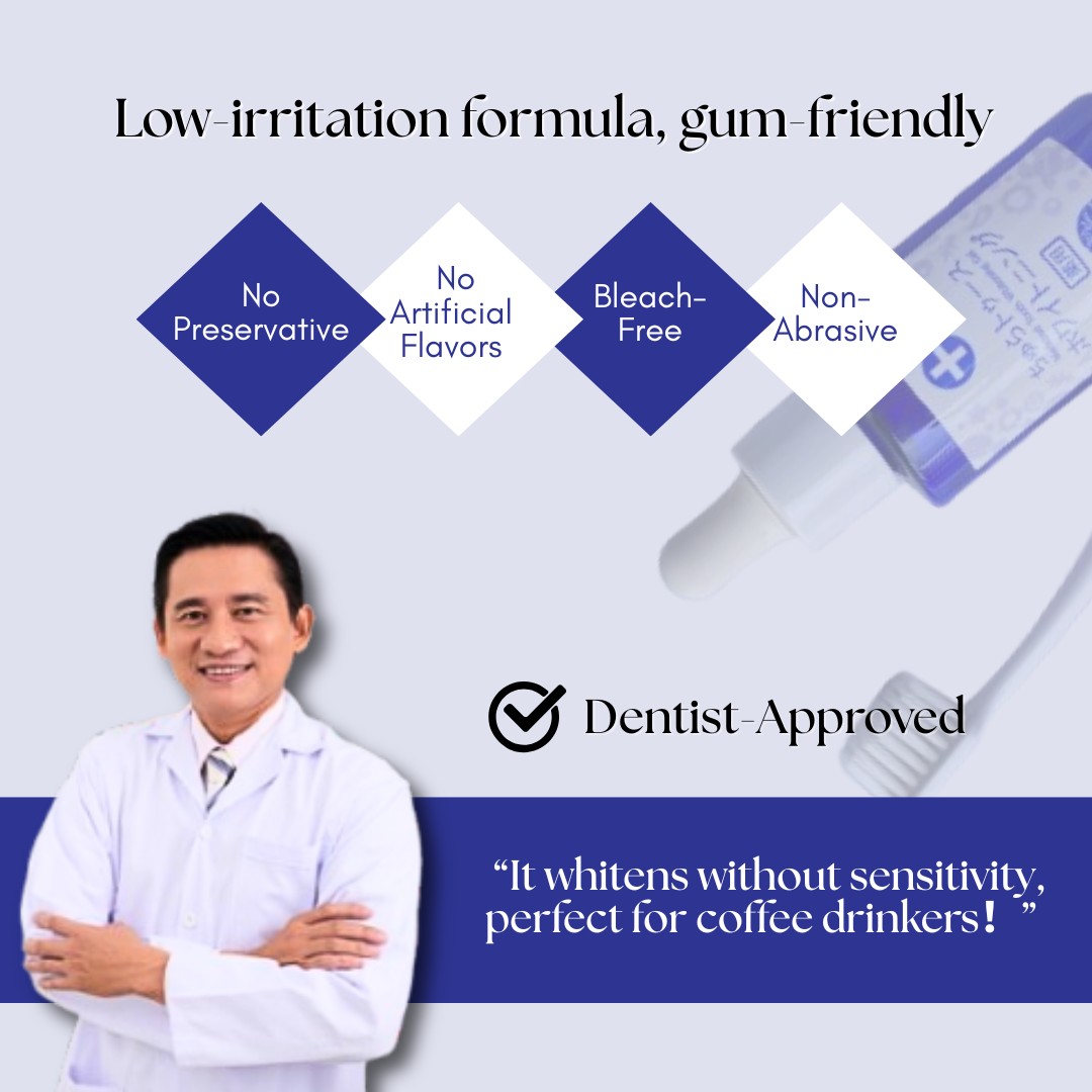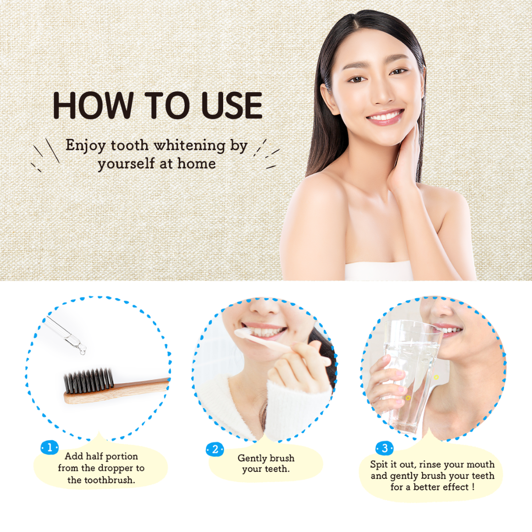| Amount of usage | The maximum amount that the glass dropper could draw (could be used for one month approximately if it is used daily). Spit it out after cleaning the teeth and rinse the mouth with water for a few times. Using it with a toothbrush will enhance the teeth whitening effect. |