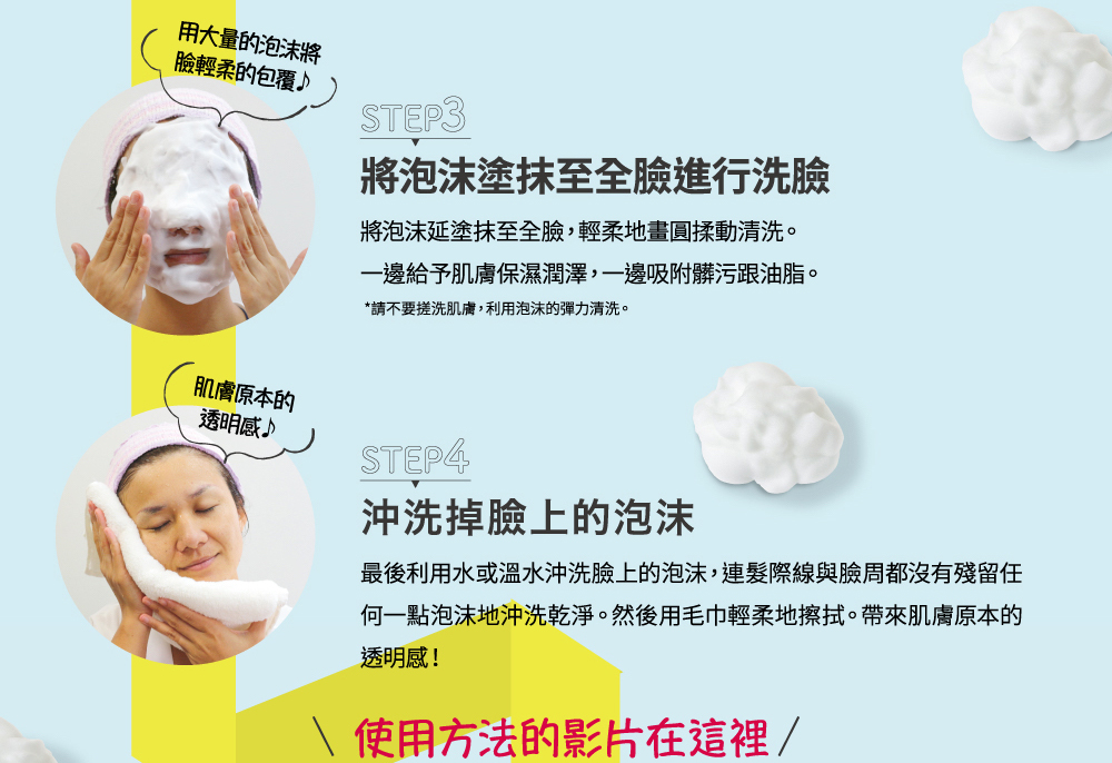 | 使用方法 | 取少量(约两粒红豆大小)于起泡网上,加入少许温水搓揉至起泡。再将富含弹力的泡沫涂抹于全脸后洗净。若要洗至颈膊处,请用温水洗净。 |