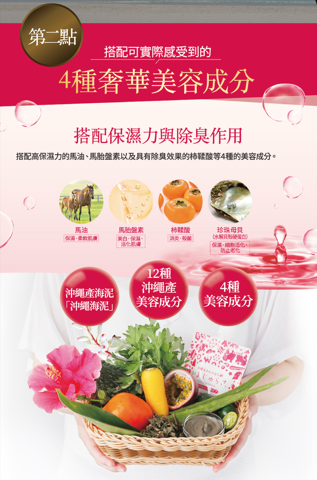 | 使用方法 | ①将水凝露挤在干爽的手上,压头约按压3-5下。②轻柔快速地涂抹于全脸。③静置约1分钟,让神奇的碳酸泡泡卸妆。④将卸妝泡泡清洗干净后,再搭配冲绳海泥洁颜乳洗脸,深层清洁不干涩! |