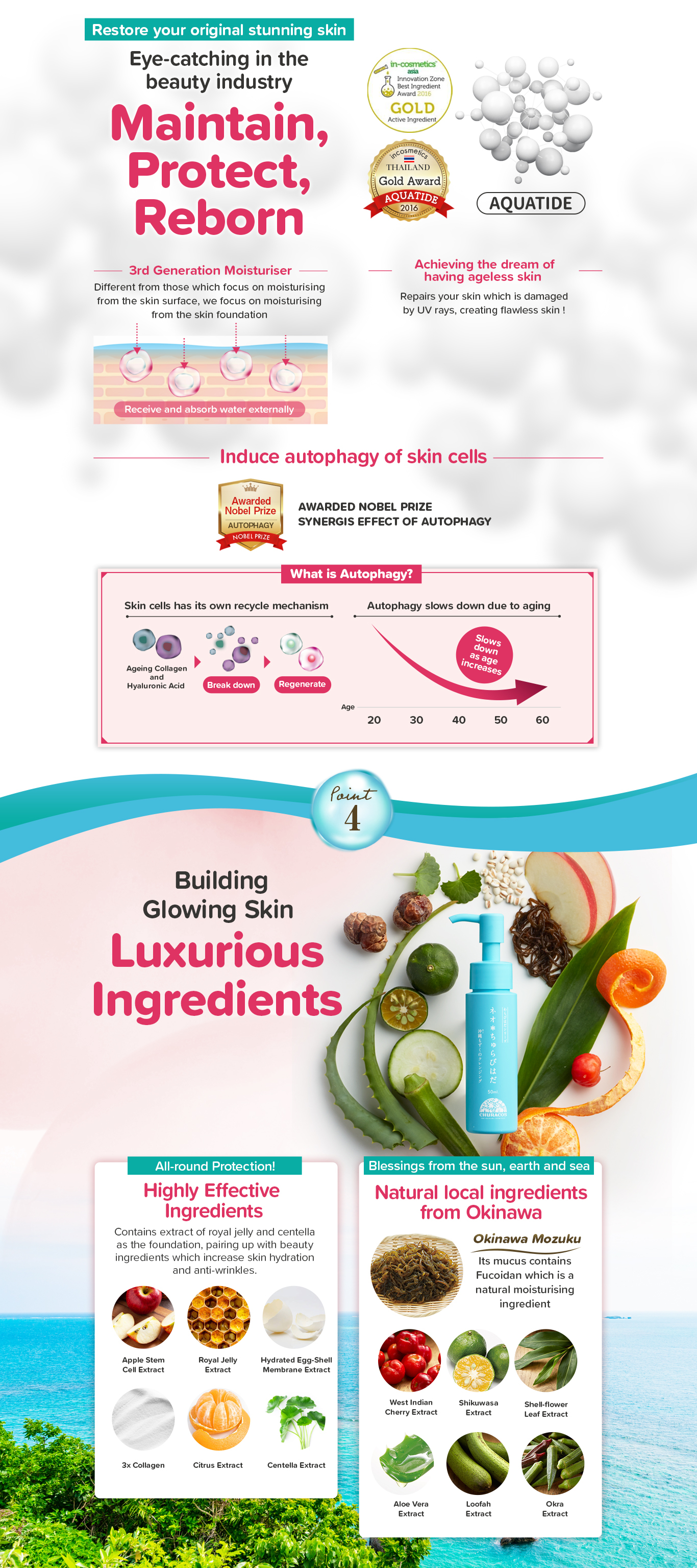 Utilizing the carbonic acid foam that doesn't harm your skin, along with the Nobel Prize-winning beauty extracts and Okinawa Mozuku, the dirt and makeup will be removed naturally while moisturizing your skin! |