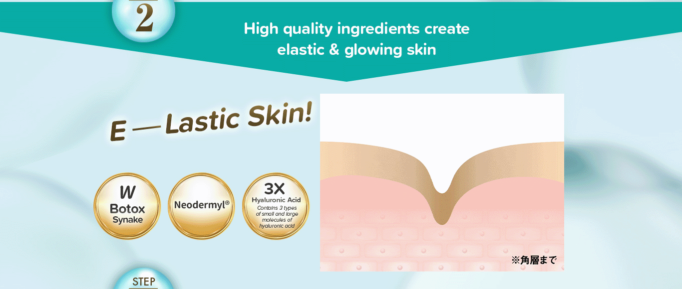 All ingredients: Water, Glycerin, Dipropylene Glycol, Butylene Glycol, Ethyl Perfluoroisobutyl Ether, Sodium C14-16 Olefin Sulfonate, Ethyl Perfluorobutyl Ether, Dipeptide Diaminobutyroyl Benzylamide Diacetate, Acetyl Hexapeptide-8, Hexacarboxymethyl Dipeptide-12, Methylglucoside Phosphate, Copper Lysinate/Prolinate, Cladosiphon okamuranus extract, Sodium Hyaluronate, Ethylhexyl Palmitate, Silica Dimethyl Silylate, Caprylyl Glycol, Hexylene Glycol, Malus domestica fruit cell culture extract, Lecithin, Hydroxypropyltrimonium Hyaluronate, C12-13 Alkyl Glyceryl Hydrolyzed Hyaluronate, Hydrolyzed Hyaluronic Acid, Collagen, Hydrolyzed Collagen, Soluble Collagen, Hydrolyzed egg shell membrane, Citrus reticulata(Tangerine) peel extract, Centella asiatica extract, Royal jelly extract, Citrus depressa peel extract, Malpighia punicifolia(Acerola) fruit extract, Aloe barbadensis leaf extract, Yokuinin Ekisu(Jpn), Hibiscus esculentus fruit extract, Alpinia speciosa leaf extract, Luffa cylindrica extract, Ascorbyl Glucoside, Enantia chlorantha bark extract, Oleanolic Acid, Hamamelis virginiana (Witch Hazel) distillate, Sapindus trifoliatus fruit extract, Sodium Bicarbonate, Dipotassium Glycyrrhizate, Arbutin, Urea, Acrylates/C10-30 Alkyl Acrylate Crosspolymer, Xanthan Gum, Methyl Gluceth-20, Potassium Hydroxide, Sodium Chloride, Cocamidopropyl Betaine, Potassium Cocoyl Glycinate, Cocamide DEA, Tetrasodium EDTA, Chlorophyllin-iron complex, Fragrance, Sodium Benzoate, Phenoxyethanol, Methylparaben, Propylparaben. | |